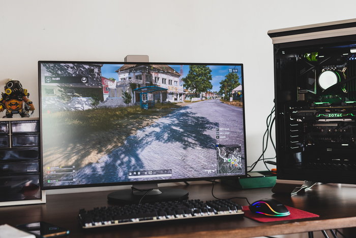 对实际游戏带来怎样的影响?对于这级别配置首先考虑的当然是搞定4K分辨率了,所以显示器我换了自己的飞利浦的329P9H来测试。这款显示器定位算是中高端显示器,四面窄边框,所见基本都是屏幕,也是因为这样的高屏占比所以之前很多人问过我具体型号。设计部分比较特别的就是可折叠收纳的LOGO设计跟顶部伸缩的摄像头,另外自带一个全功能的Type-C口,除视频信号以外,最高支持65W供电输出。