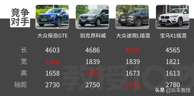 探岳GTE是标准的中型SUV身材,车身尺寸比起竞品没有太大的优势;但是话说回来,插电混动的中型SUV也屈指可数,这个细分市场里面,探岳GTE的尺寸也没有太大的劣势。